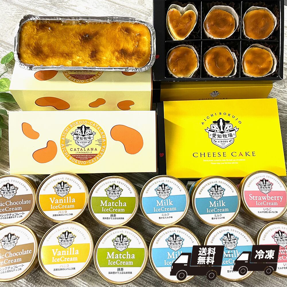 送料無料 愛知牧場冷凍スイーツセット(アイス12個カタラーナ2箱チーズケーキ2箱)